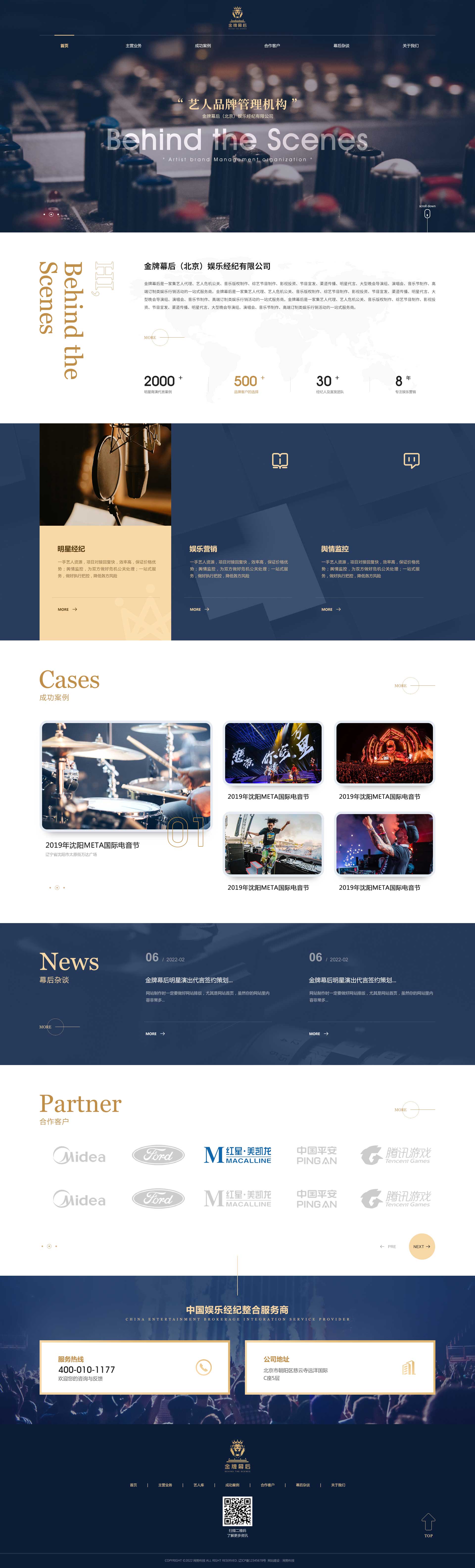 金牌幕后(Behind the Scenes),中國(guó)高端藝人品牌管理機(jī)構(gòu)。多年來,公司憑借著龐大的藝人資源,優(yōu)良的專業(yè)品質(zhì),高效的執(zhí)行能力和一流的品牌服務(wù),為近500家品牌客戶成功定制了超過2000個(gè)的專業(yè)項(xiàng)目,贏得了客戶的認(rèn)可,并和多家品牌客戶建立了長(zhǎng)期的密切合作關(guān)系。